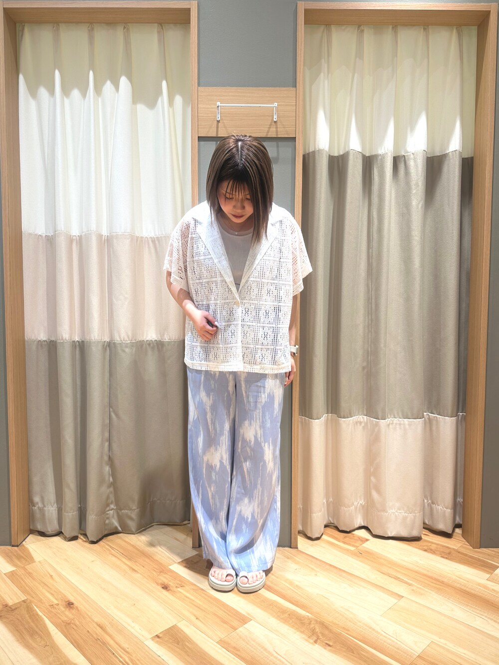 総レースが上品さを演出するシャツジャケット𓂃🥀 サッと羽織るだけでも、 こなれ感のあるレイヤードスタイルが楽しめます🌟 涼し気な色合いのイージーパンツ👖 ウエストはゴム仕様なので安心感があります☝🏻 接触冷感機能がついているのが嬉しいポイント💫
