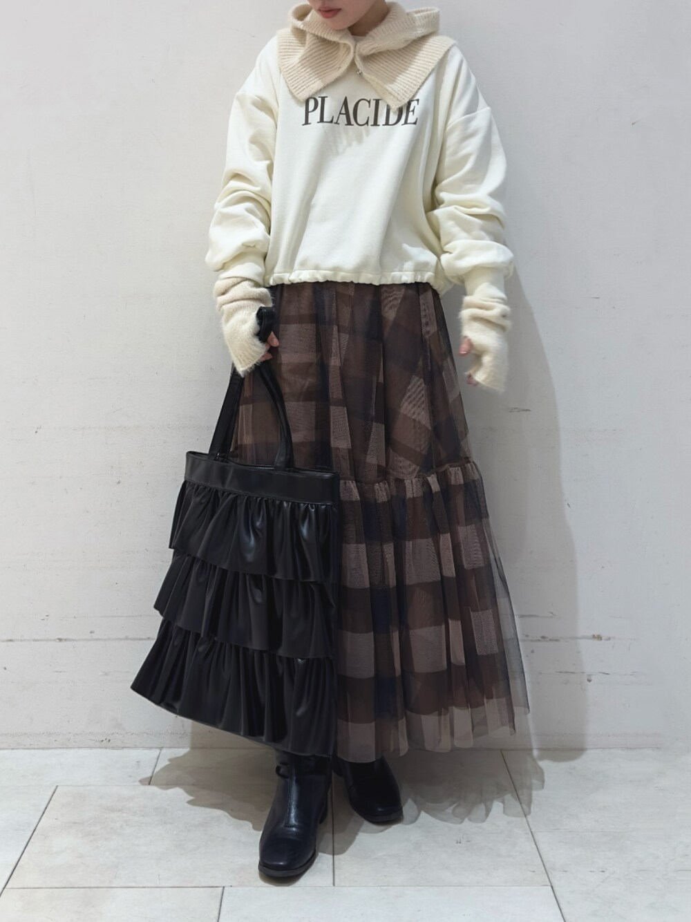 ボリュームのあるチュールスカートが主役のコーディネート。 合わせたスウェットは丈短めで裾が絞れる仕様なので、低身長さんでもバランス良く着こなせます! バラクラバ+アームウォーマーで暖かさをプラス◎