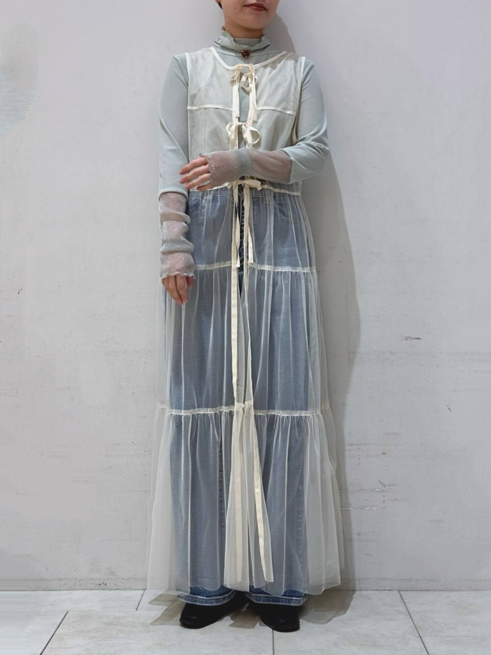 チュールの透け感が可愛いレイヤードコーデ。 全体的に淡色でまとめて春を意識してみました☘️ デニムパンツは履き心地がとても柔らかく、ストレスフリーな着心地。 こちらのパンツ1枚あると1年中着回せます! 今回は5cmヒールを合わせて着用しています。