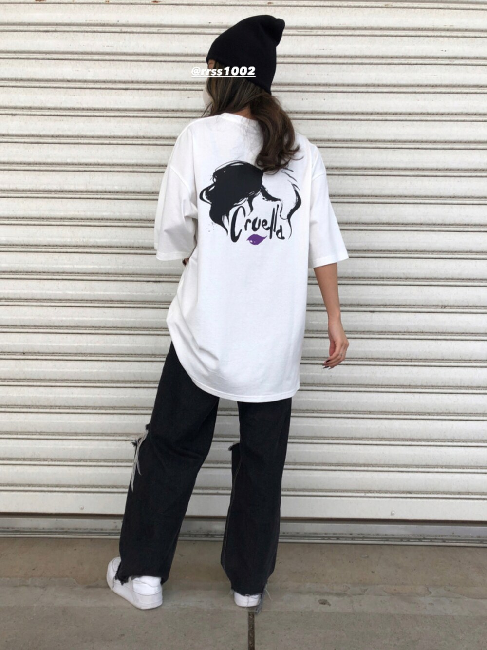 クルエラTシャツはクールな バックプリントがポイント💋💜 サイズ感が結構大きめで1枚でも着れそう♩