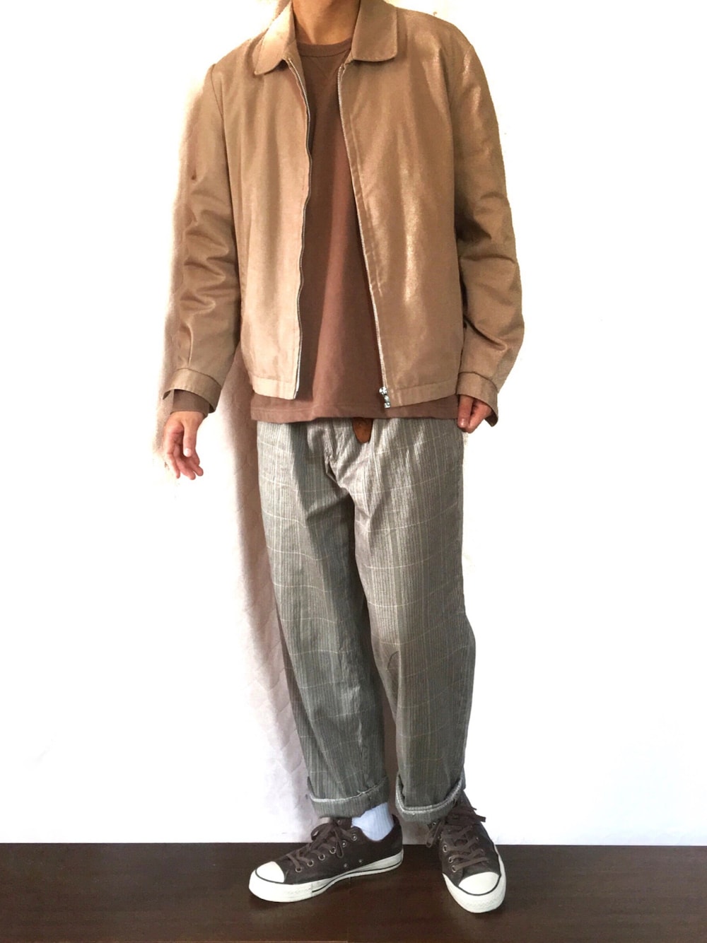 ブラウン系のスニーカーを着用したメンズの冬コーディネートの1枚目の写真
