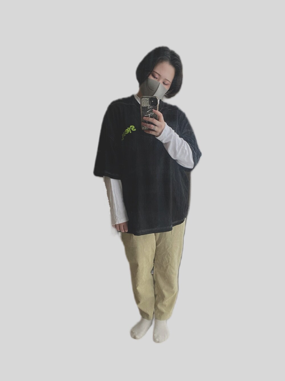 ブラック系のTシャツ/カットソーを着用したレディースの春コーディネートの1枚目の写真