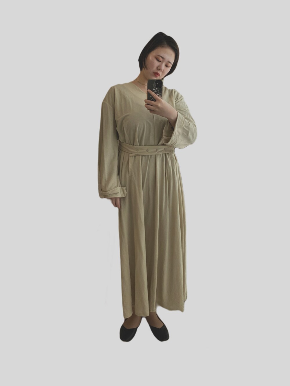 ベージュ系のワンピース、ブラック系のシューズを着用したレディースの秋コーディネートの1枚目の写真
