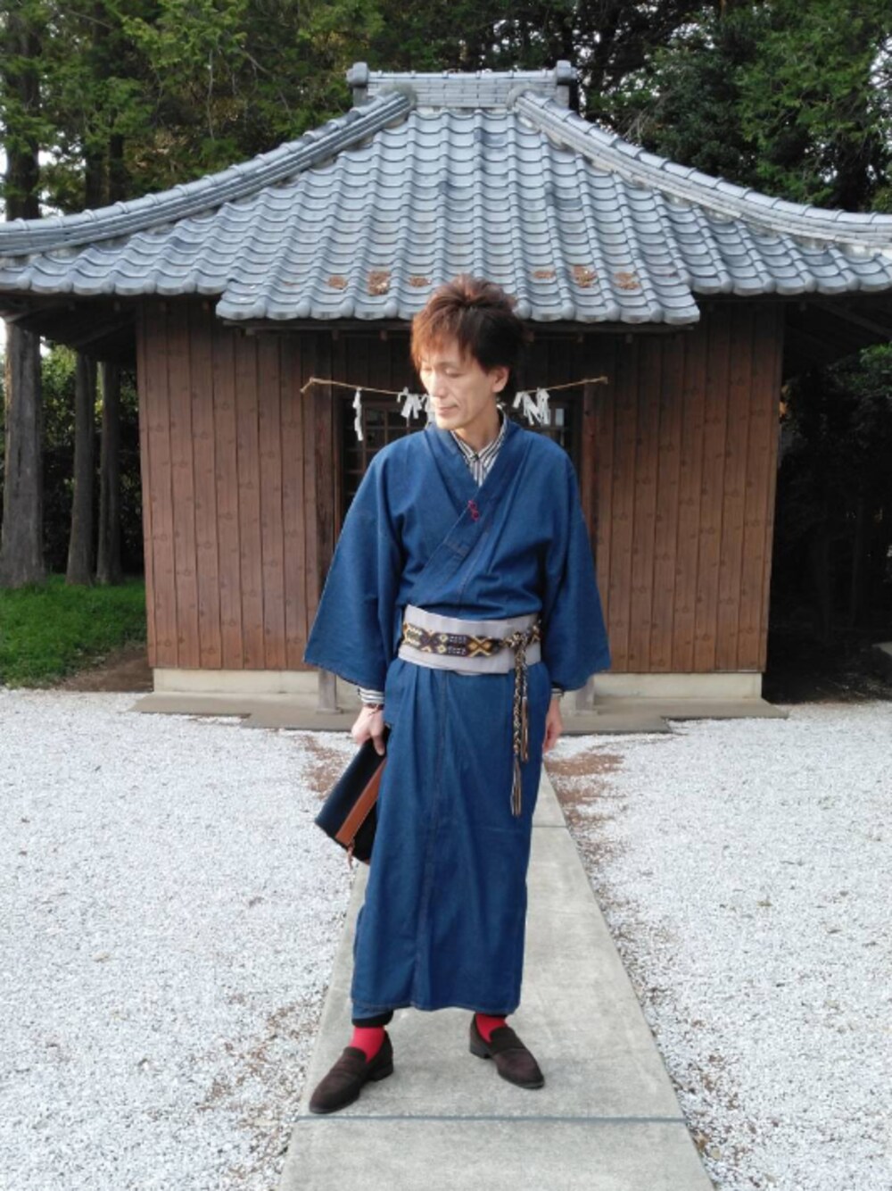 久しぶりに着物を着ました。正確には妻に着せてもらいました(笑)。通年使用できるデニム着物です。妻も着物コーデをupするので、是非見てあげて下さい。 デニム着物。 シャツは黒ストライプ。 黒スキニーを着用。 クラッチはキクチタケオ。 とめ帯はBEAMSの女性用ベルト! 綺麗めヌバックレザーの靴。 完成。 妻と私の共同スタイリング…ですね、