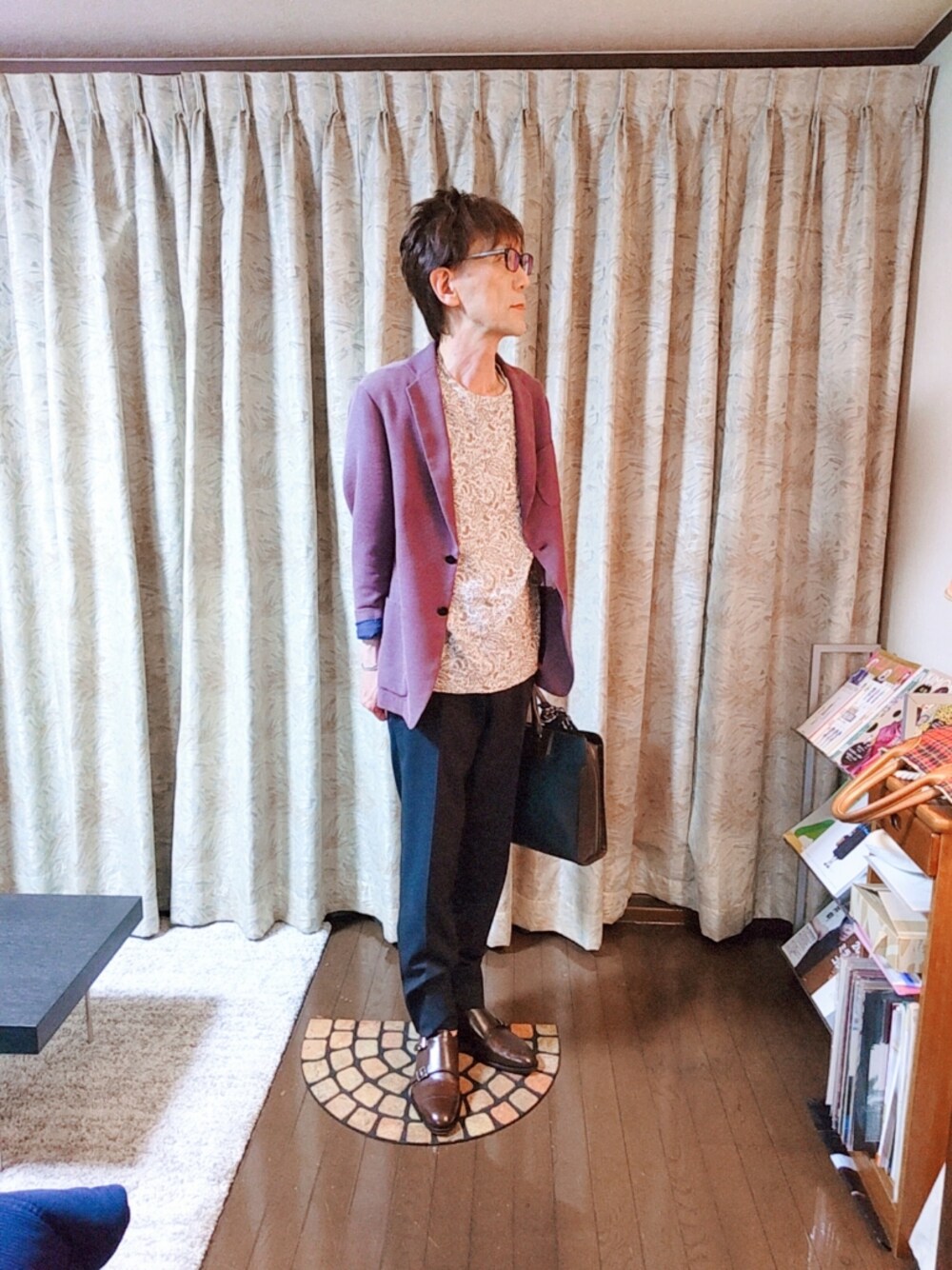 TOMORROWの大人っぽい2つのアイテムを使用したコーデです。パープルのリネンブレンドジャケットとブラウン基調のデザインカットソーです。この合わせは結構気に入っておりまして、この日も通勤で帰宅後に撮りました。ジャケパンコーデ…。 今の時期はジャケットを着るなら通気性の優れた穴だらけのものを着用したいです(笑)。かつ、インナーはカットソーで…。ペイズリー柄のブラウンは落ち着いていて注目度も高く、トゥモローの2アイテムは派手めを抑えて良い感じで合わせられます。 ユニクロのダークネイビーのウールスラックスは、高品質でもう3年以上使用しています。ダブルモンクは久しぶりに履きましたが、かっこいいナ、と自分でも思います(再笑)。