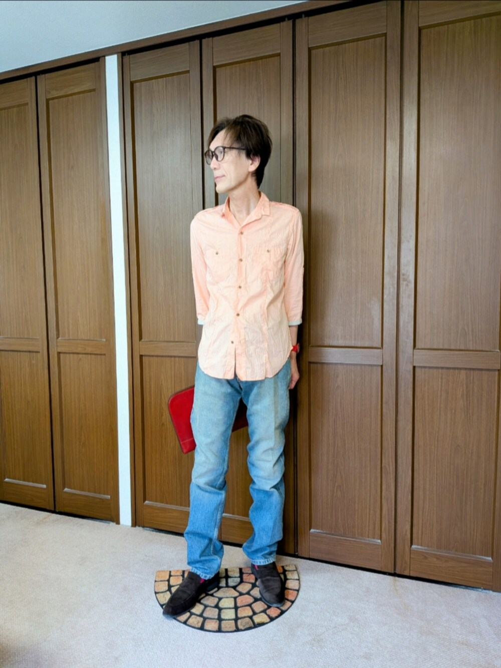質感の高いしっとりとした生地を使ったデニム。はき心地は最高です。裾に軽いダメージをさりげなくいれたのも、お気にいりです。ヘビロテアイテムのひとつ。 シワ感の強い個性的なオレンジの7部丈シャツと合わせました。初夏のコーデです…。