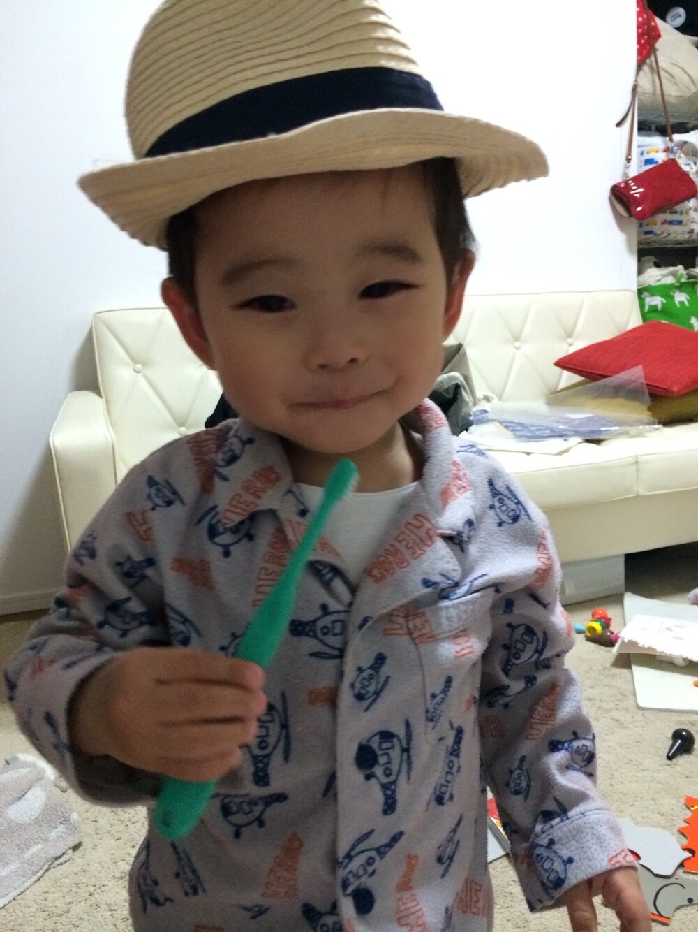 パジャマなのに、今からもう寝るのに、勝手にハットを被る息子。