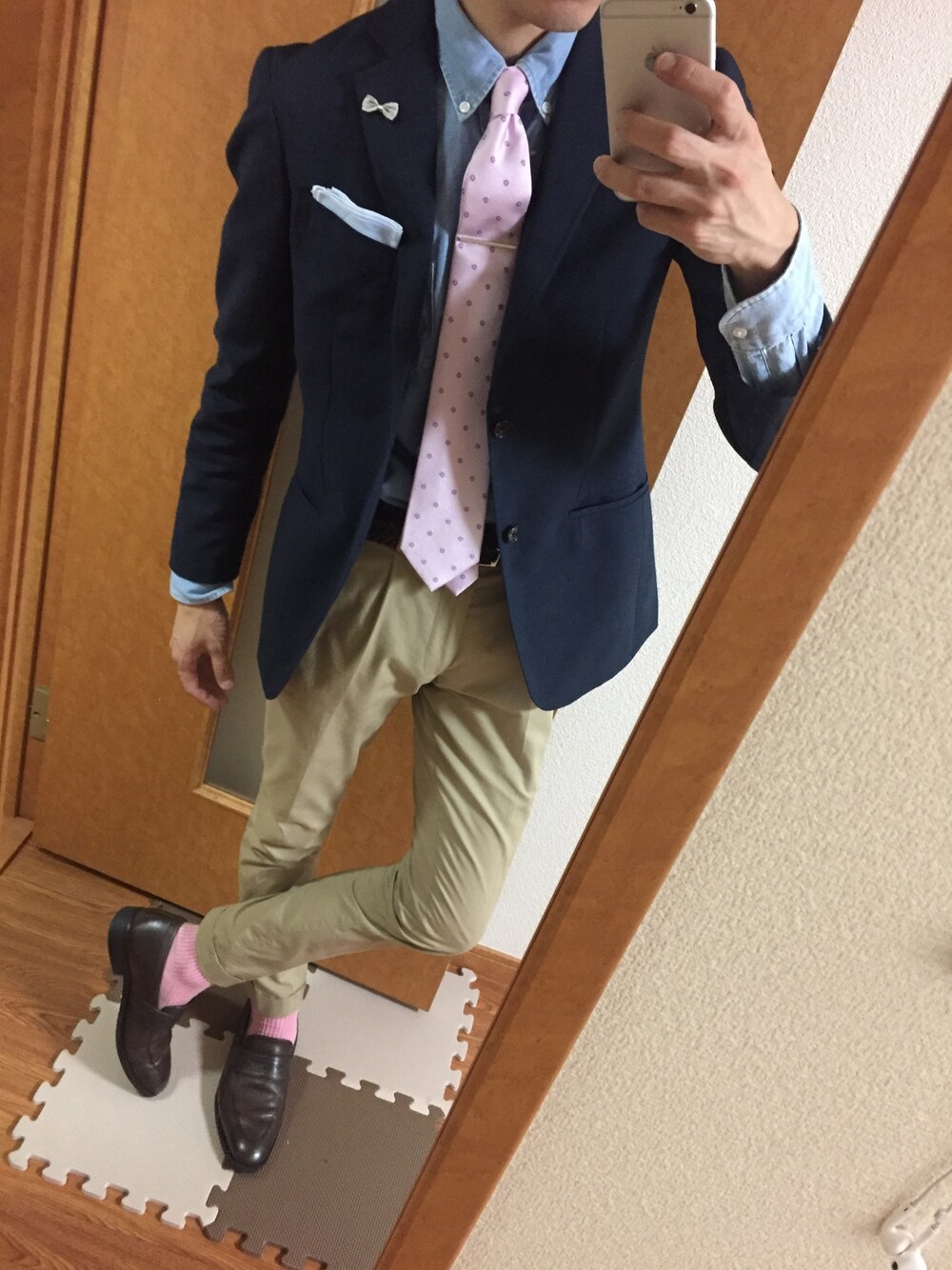 ジャケパンビジネスカジュアルスタイル ネイビー×ベージュは相性がよろしい タイとソックスで色をリンク、シャツとチーフで色をリンク 白シャツにピンクタイだとおっちゃんぽくなるので水色系のシャツがオススメ