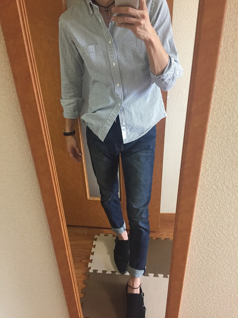 綺麗めカジュアルスタイル 普段仕事で使ってるシアサッカーシャツにデニムを合わせてカジュアルダウン ロールアップと小物でさらにラフに