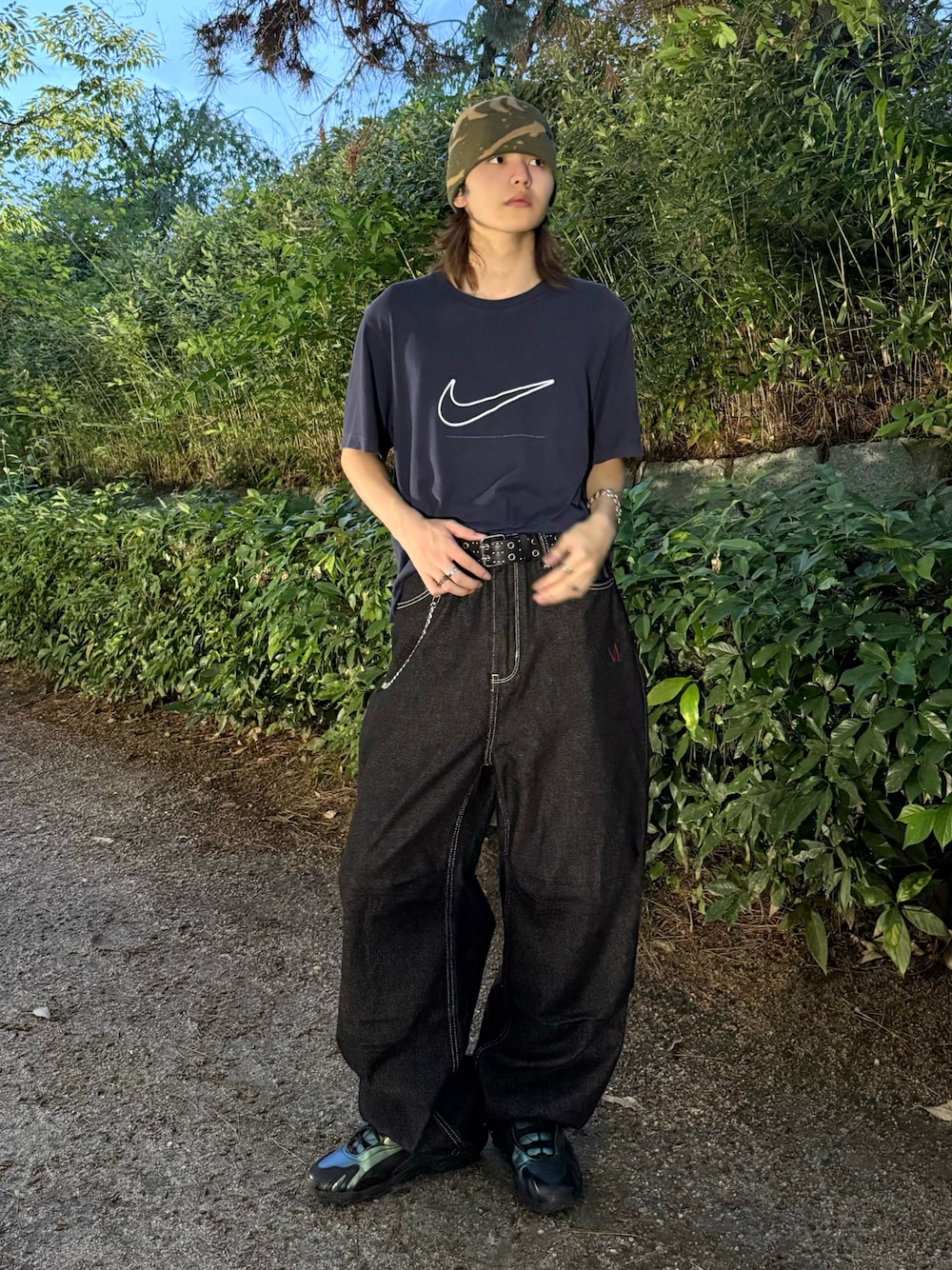 2個前の投稿のテックストリートに比べストリート強めに組んだコーデ ネイビーのTシャツは有能すぎるので1着は持っときましょう、、🥶