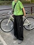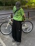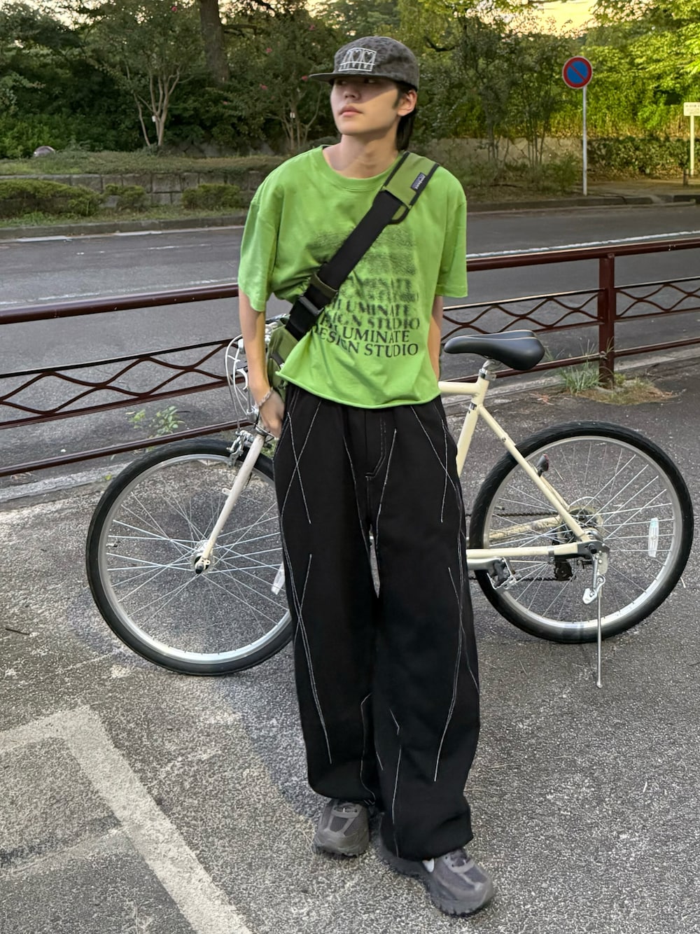 発色良いグリーンのTシャツにデザインが効いた黒のスウェパンを合わせたシティーボーイコーデ トップス&バッグの同色合わせ、 柄キャップで個性を◎