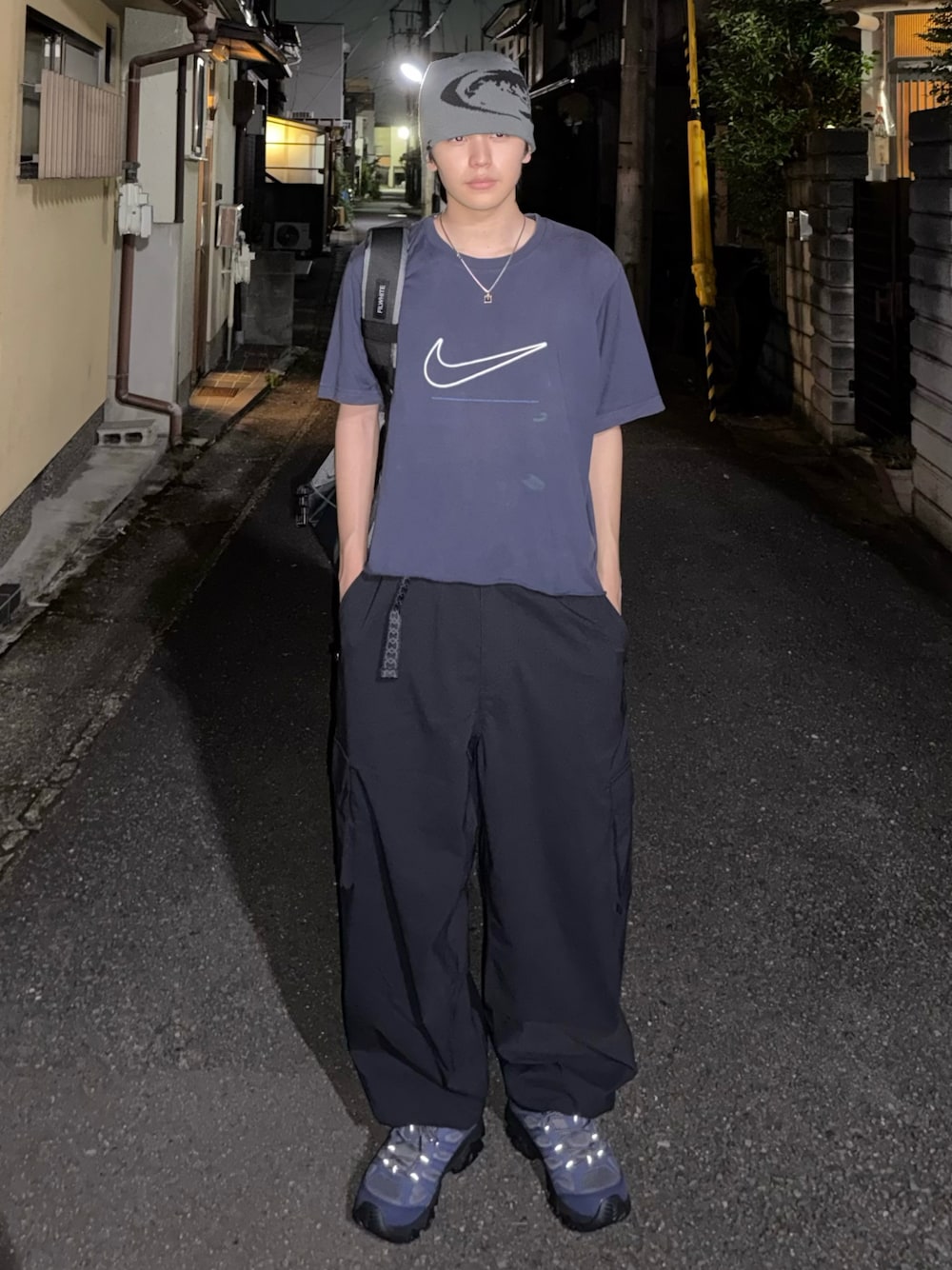 落ち着いたカラーでまとめたコーデ ビーニー&nikeの短丈Tに、ワイドナイロンパンツ&MERRELLのgoretexスニーカーを合わせてストリートとテックをmixして🗻