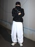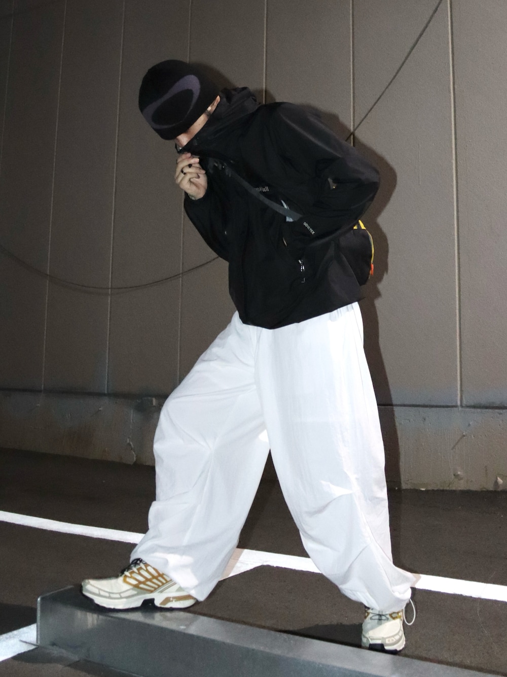 モノトーン、黄色の差し色で組んだゴープコアコーデ テック系は白のナイロンパンツ汎用性高くて使いやすいのでおすすめです🐼