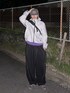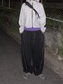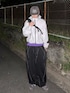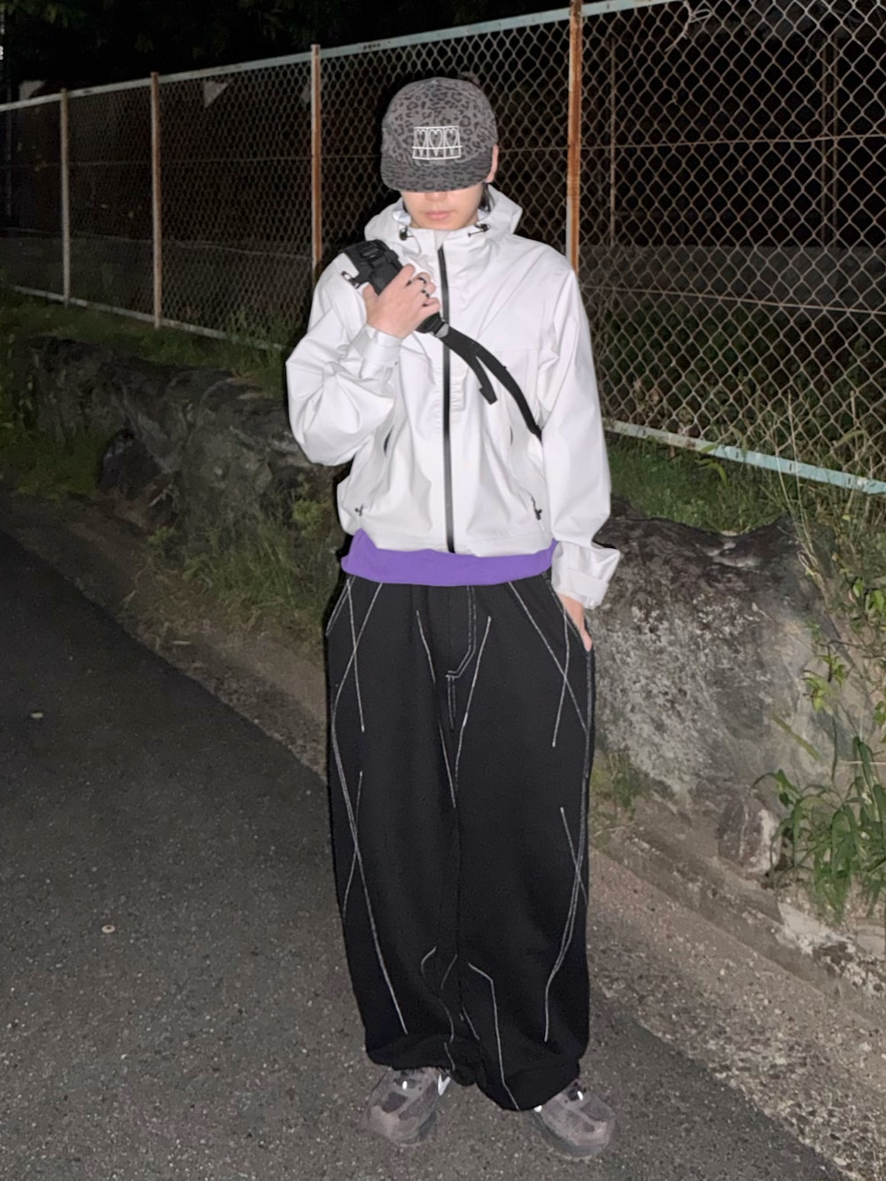 モノトーンにパープルの差し色で組んだテックコーデ かっこよすぎるライトグレーのシェルジャケットにあえてラフなスウェパンでバランスを🐻❄
