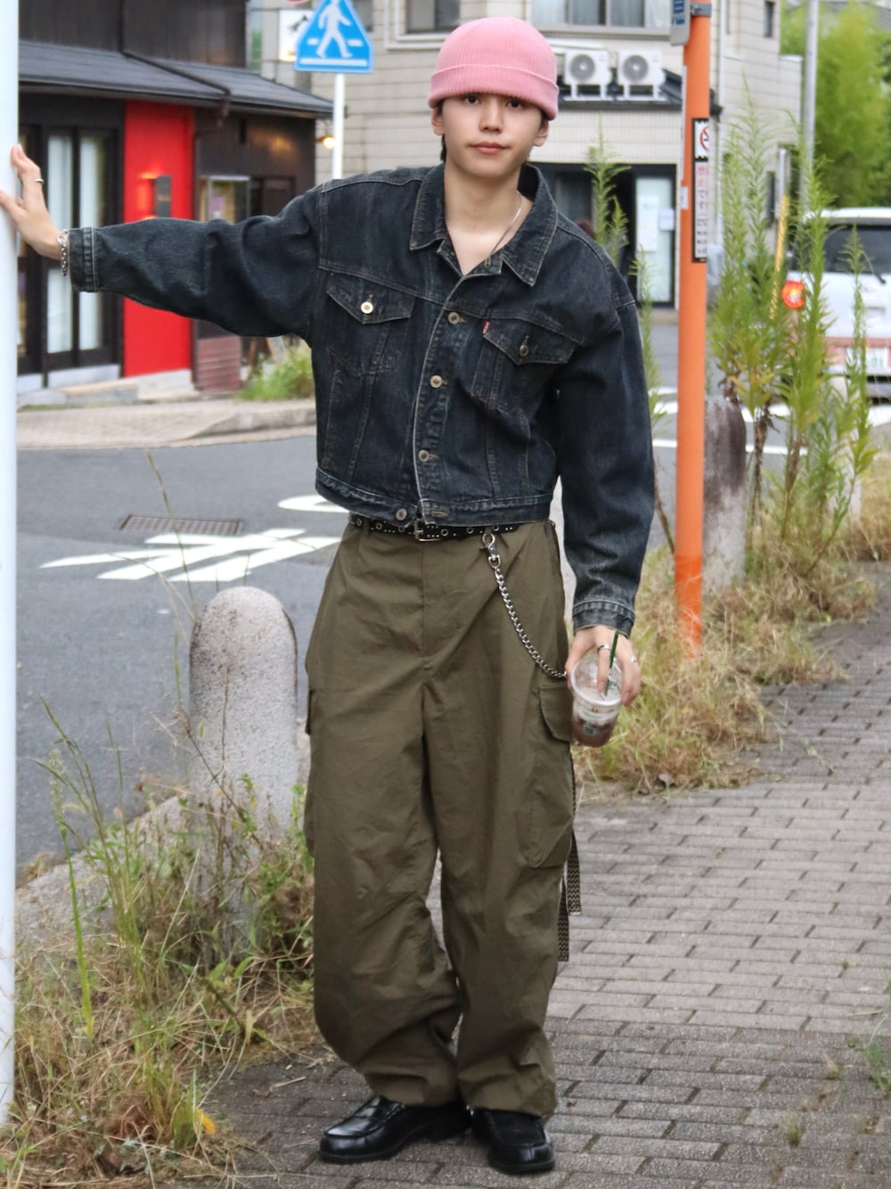 デニジャケ×カーゴの無骨な組み合わせのアメカジストリートコーデ ピンクビーニーとローファーで抜け感、上品さを◎ デニムジャケット、カーゴパンツは濃い色にすると春っぽさより秋っぽさ出ます🍁 アイテムの詳細は↓↓↓