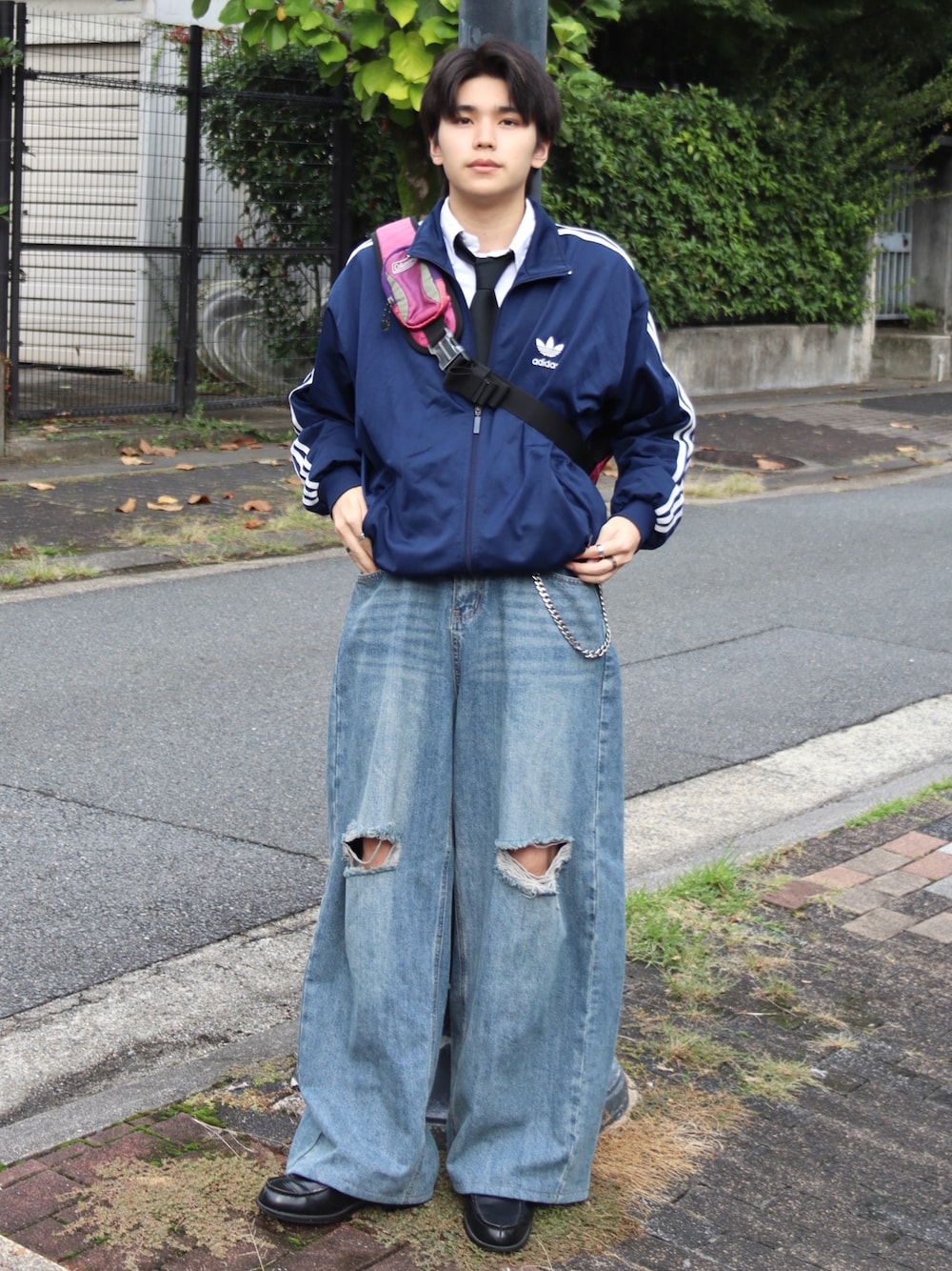 Adidasの80sトラックジャケットで組んだ海外ボーイ風スポーツミックススタイル ブルートーンにピンクのショルバが映えてる◎ トラックジャケットはかなりカジュアルなアイテムなのでシャツタイ、ローファー等のきれいめアイテムを取り入れてバランス取るのがおすすめ🪼