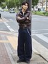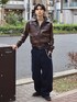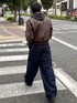 レザージャケット×デニムの王道ストリートコーデ ブラウン×ネイビーが大人っぽくて良い◎ インナーにジップパーカーを仕込んで防寒&脱いでもかっこいいスタイルに🧵