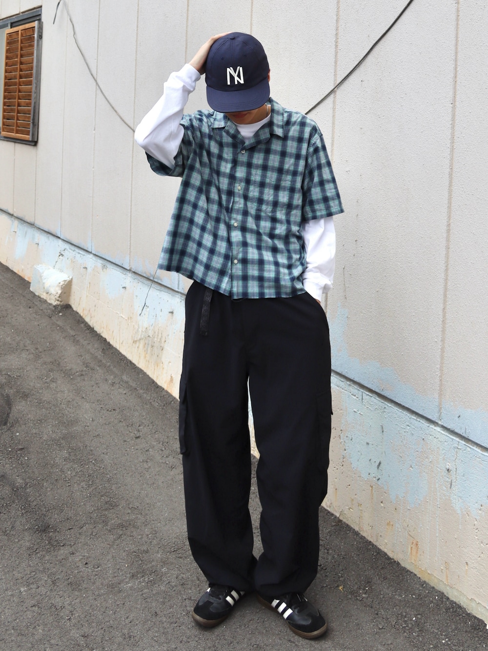 チェックの半袖オープンカラーシャツに白のロンTをレイヤードしたシンプルストリートコーデ 半袖シャツにロンTレイヤードはTシャツよりも大人っぽく見えて◎ ローテクのスニーカーを合わせて🛹
