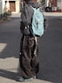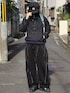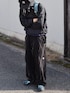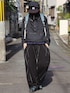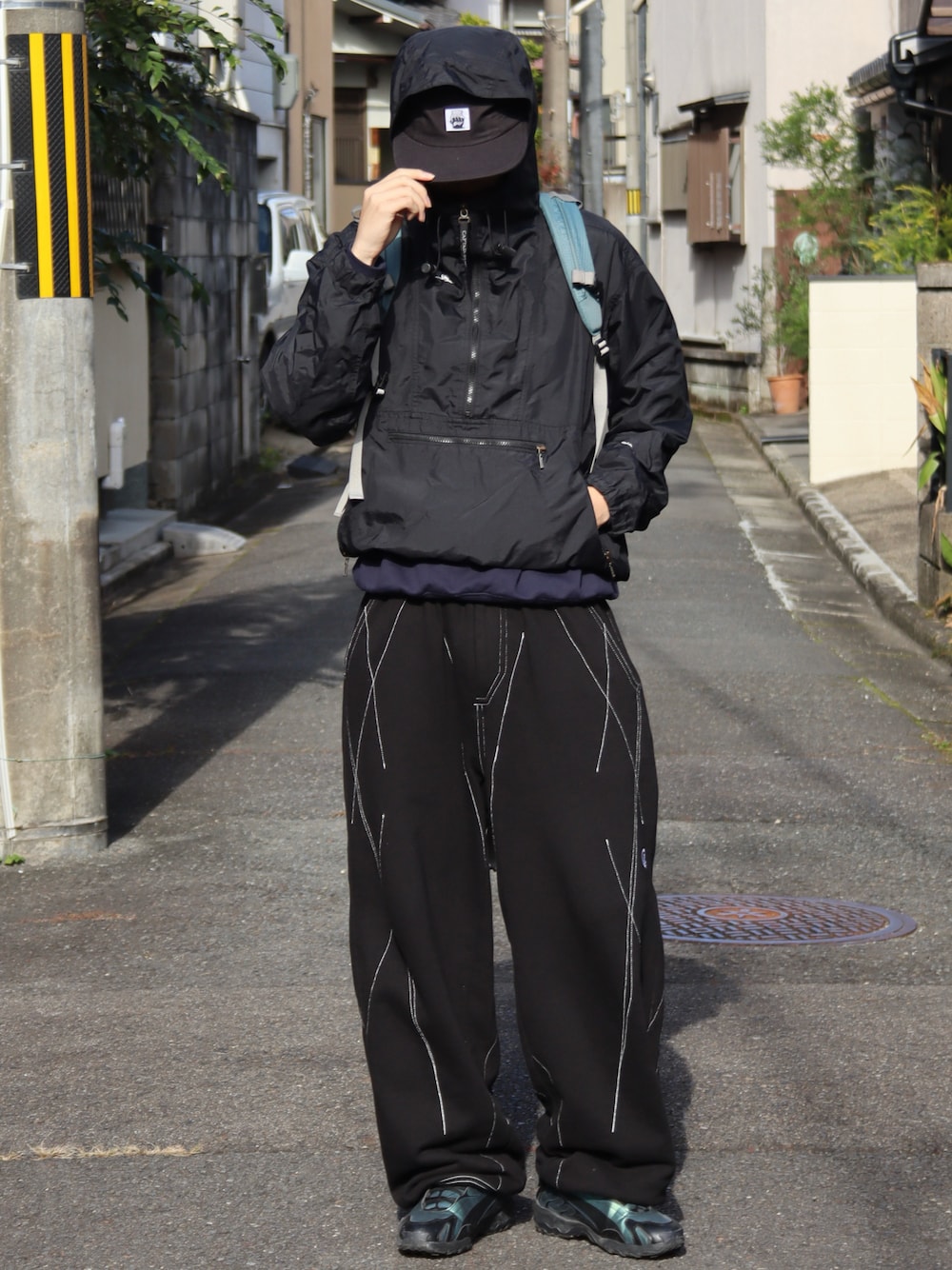 オールブラックをベースにブルー系の差し色をいれたゴープコアコーデ 同じ黒でも素材を変えて野暮ったくならないように◎ ゴープコアスタイルはアウトドアアイテムで固め過ぎないことで街に馴染むコーデになります🛝