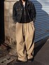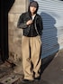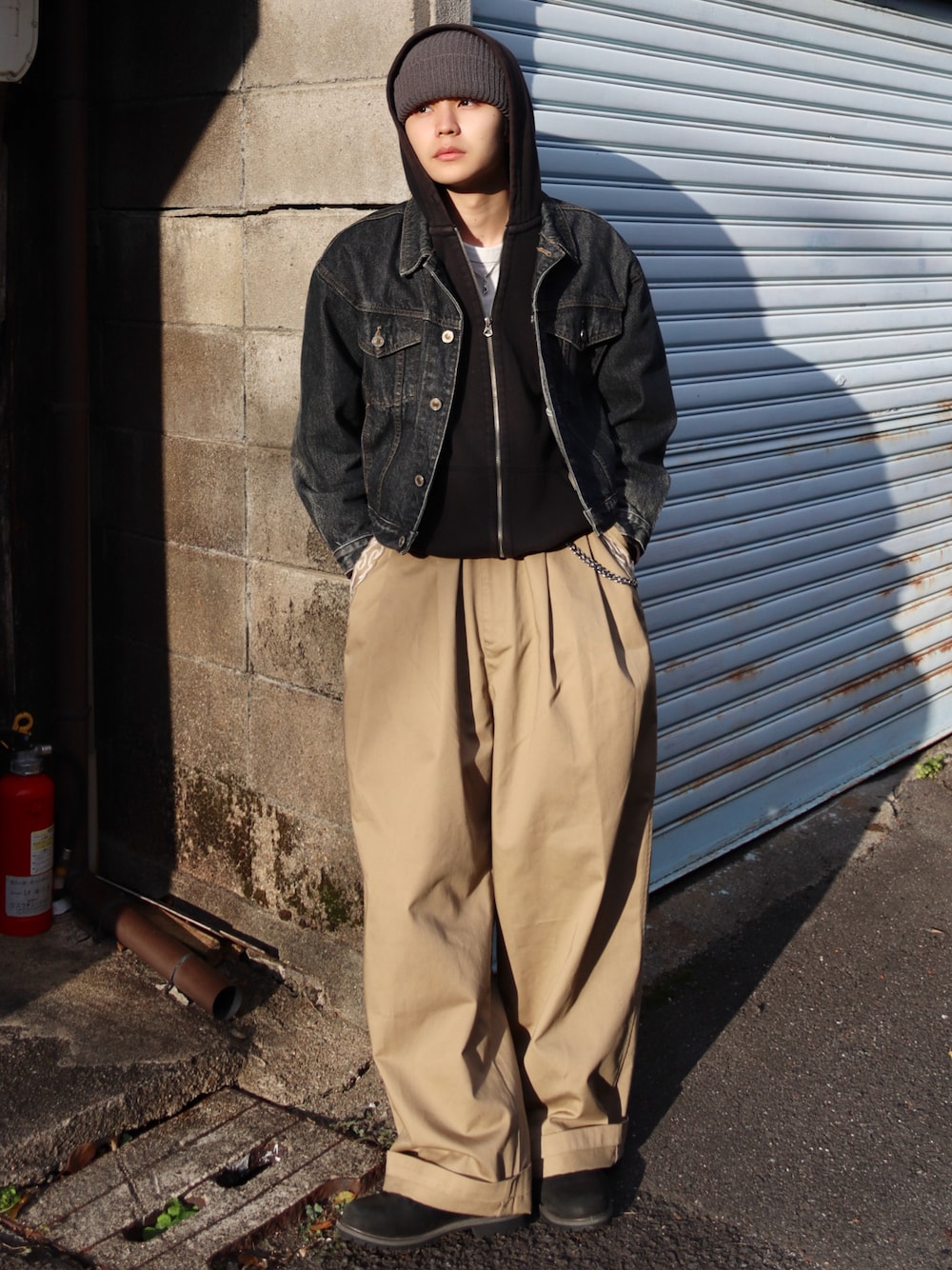 古着アイテムをmixさせたアメカジストリートコーデ 全体の重めな雰囲気に白Tチラ見せで抜け感を◎ デニムジャケットをブラック、ビーニーをチャコールグレーにして落ち着いたストリートに🫏