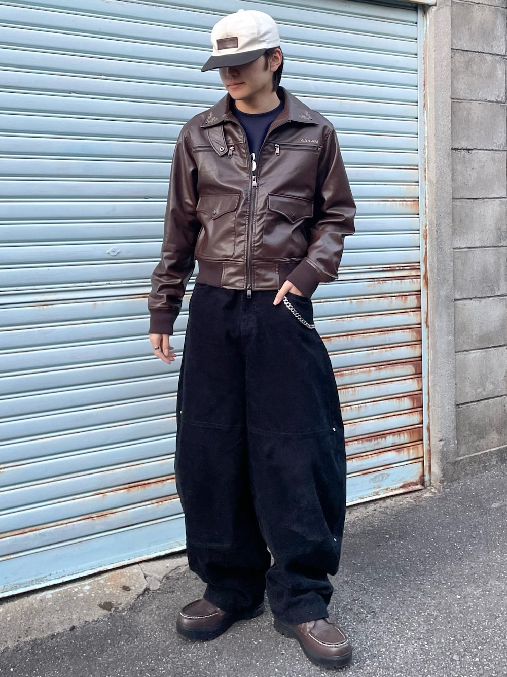 レザージャケットにコーデュロイパンツを合わせたアメカジストリートコーデ インナーをネイビーにしてブラウンと合わせて大人っぽく◎ 日中15℃くらいまで上がる日はレザーがちょうどいい🦔