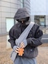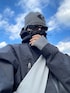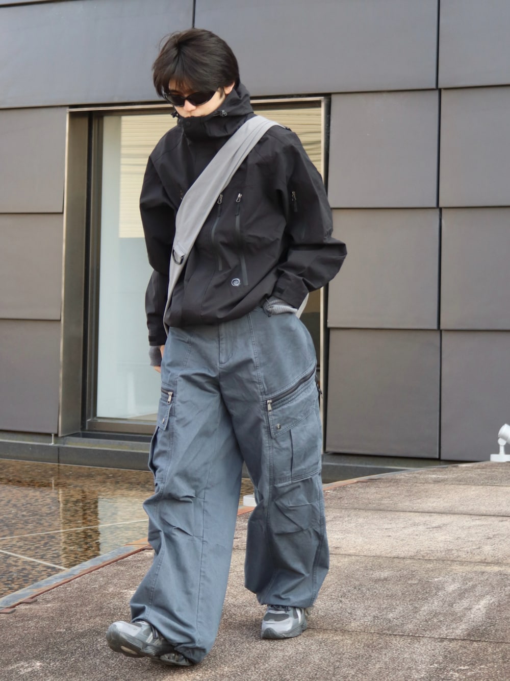 Travelの黒マウンテンパーカーを使ったゴープコアコーデ ゴープコアコーデをする時は顔周りの装飾で差をつけれると思ってるので、ビーニーやスポーティなサングラスはあると一気に完成度上がります◎ 小物でグレー拾いまくるのハマってます🐻❄️