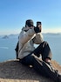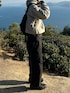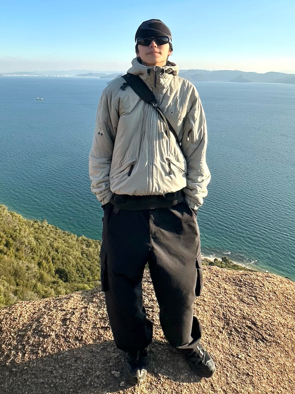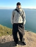 街でも映えるシンプルで洗練されたアウトドアコーデ 黒多めの中にあるくすんだチャコールグレーのTシャツのレイヤードがこなれ感出てお気に入り◎ 堂々と立ってますが断崖+強風でガクブルしてます🌳