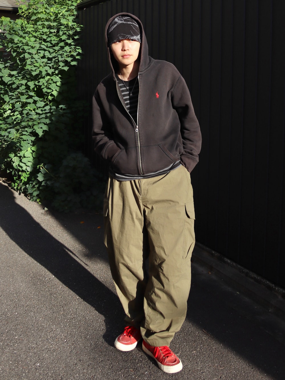 アウター無しの古着mixアメストコーデ。 このPOLOのフーディ色褪せたフェード感がたまらなくて◎ 古着っぽいアメカジ要素を足したかったのでロゴと色を拾った抜け感あるローテクスニーカーを🚨