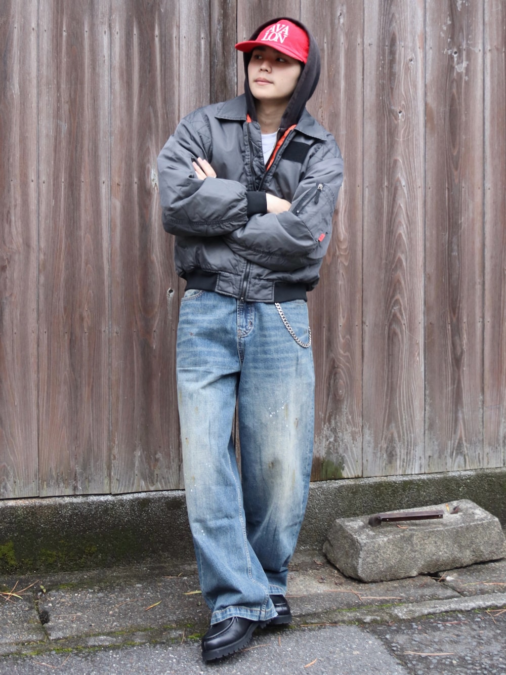 フライトジャケットを使ったアメカジストリートコーデ ミリタリー、ワークなアイテムをストリートに落とし込んで男らしいスタイルに◎ 新調したこのデニムがワーク感あるヴィンテージ加工で雰囲気あるしまじでかっこいい、、 こういうデニム探してた👖