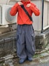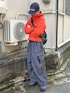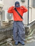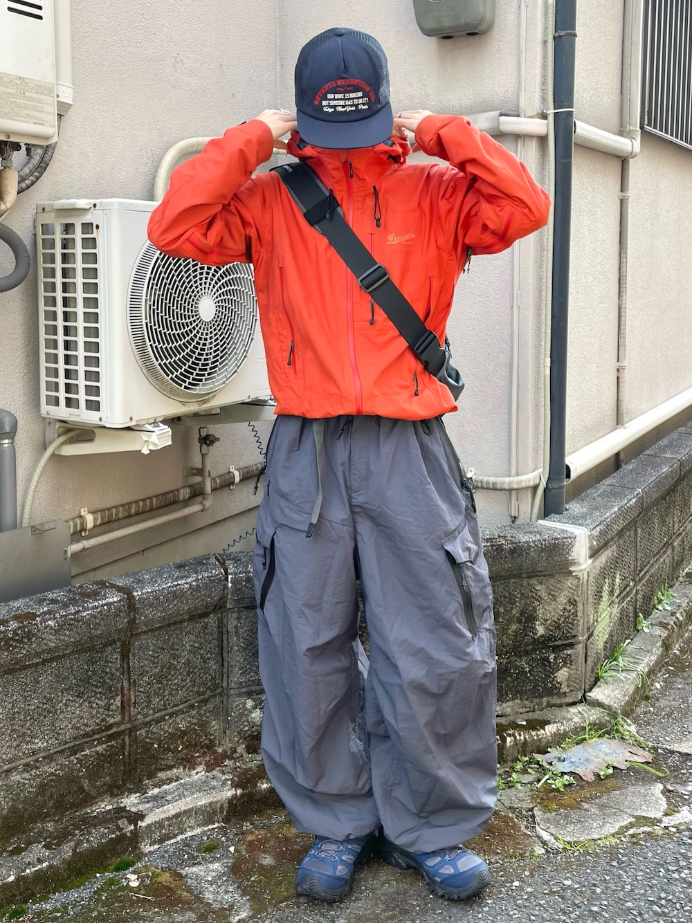 Dannerのマンパを使った春のテックシティコーデ 上下を寒色にしてオレンジを挟んで色のバランスを調整◎ このMANASTASHのナイロンパンツかなりワイドでシルエット良くてテック系・ゴープコアコーデに最高すぎる🐺
