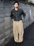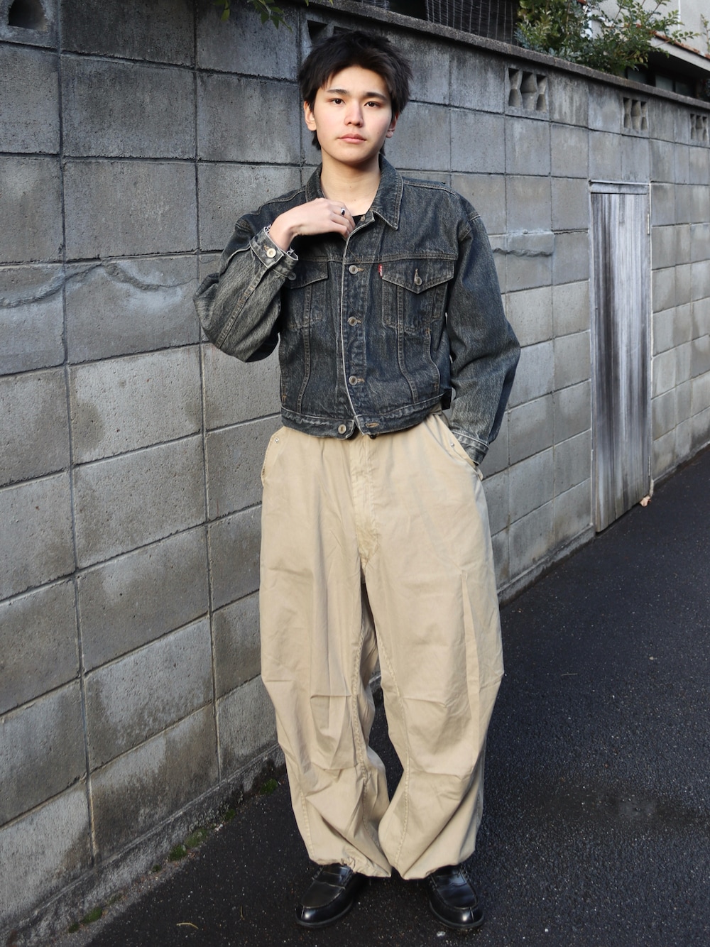 Big johnの古着デニムジャケットを使った大人っぽいワーク×シティコーデ 短丈×ジャストめなデニムジャケットにワイドパンツでルーズなシルエットに◎ 無骨なデニムジャケット×ローファーで大人っぽく🚬