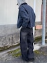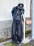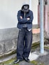 MUSINSASTANDARDのワークジャケットを使ったシティ感あるワーク×ストリートコーデ 全体をダークトーンでまとめて、色数を抑えることでストリートながら大人っぽい印象に◎ ストリートな雰囲気にシティなローファーがハマってる♟
