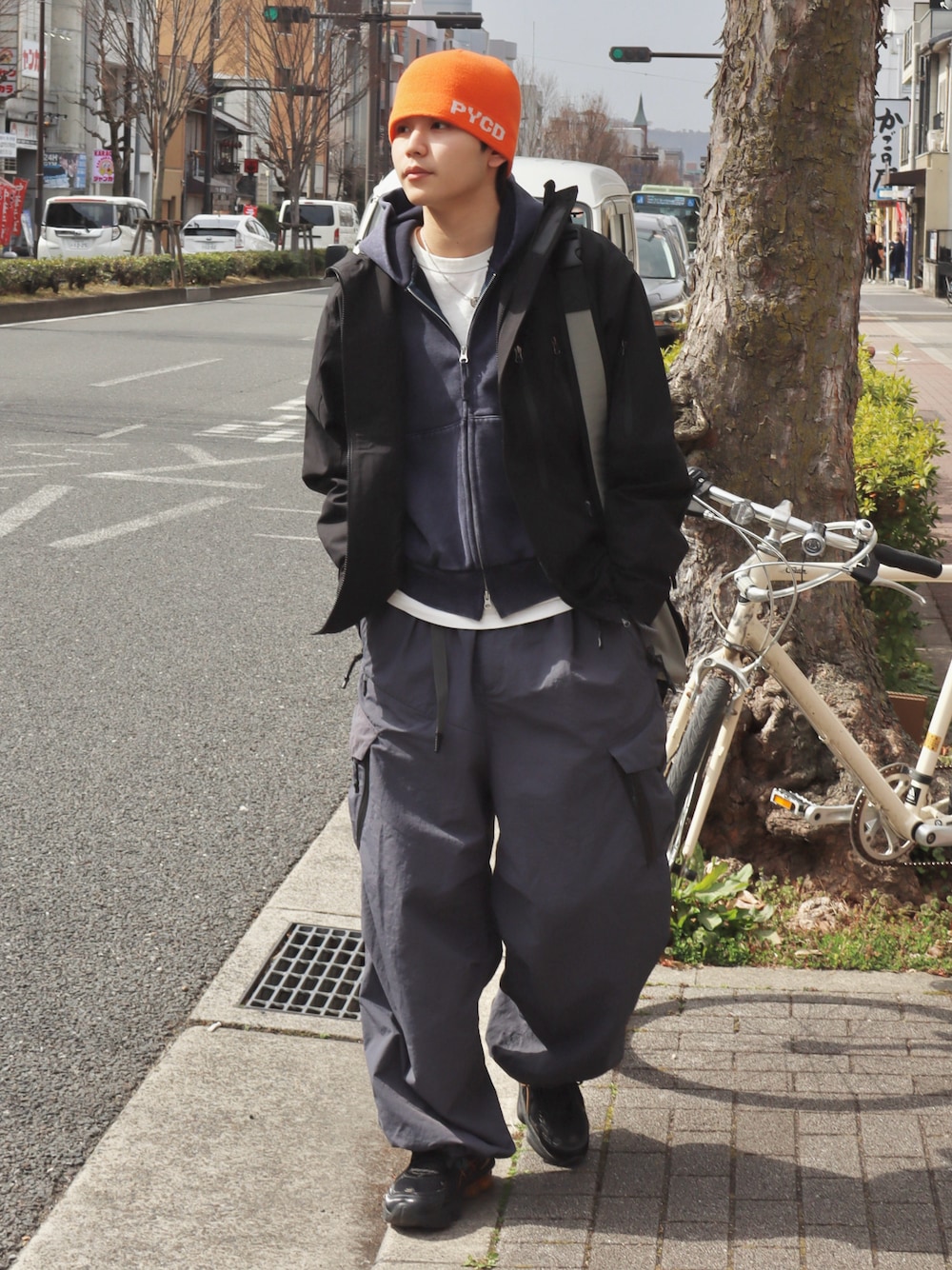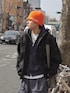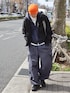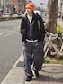 アウトドアなアイテムを取り入れたシティストリートコーデ オレンジのビーニーで差し色を◎ このラフなアイテム合わせ、シルエットが好み🥕