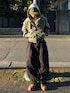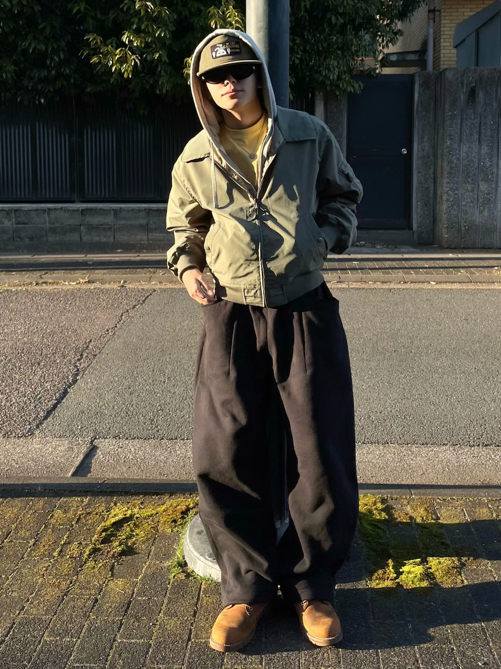KutirのMA-1にTimberlandのブーツを合わせた無骨な海外ストリートコーデ トラッカーキャップ、フード、サングラスのレイヤードで顔まわりにボリュームを◎ このジャケットめちゃかっこよくてカーキとベージュのリバーシブルで使いやすいのに¥6000以下なのハンパない^^ 他カラーもイケてた🍈