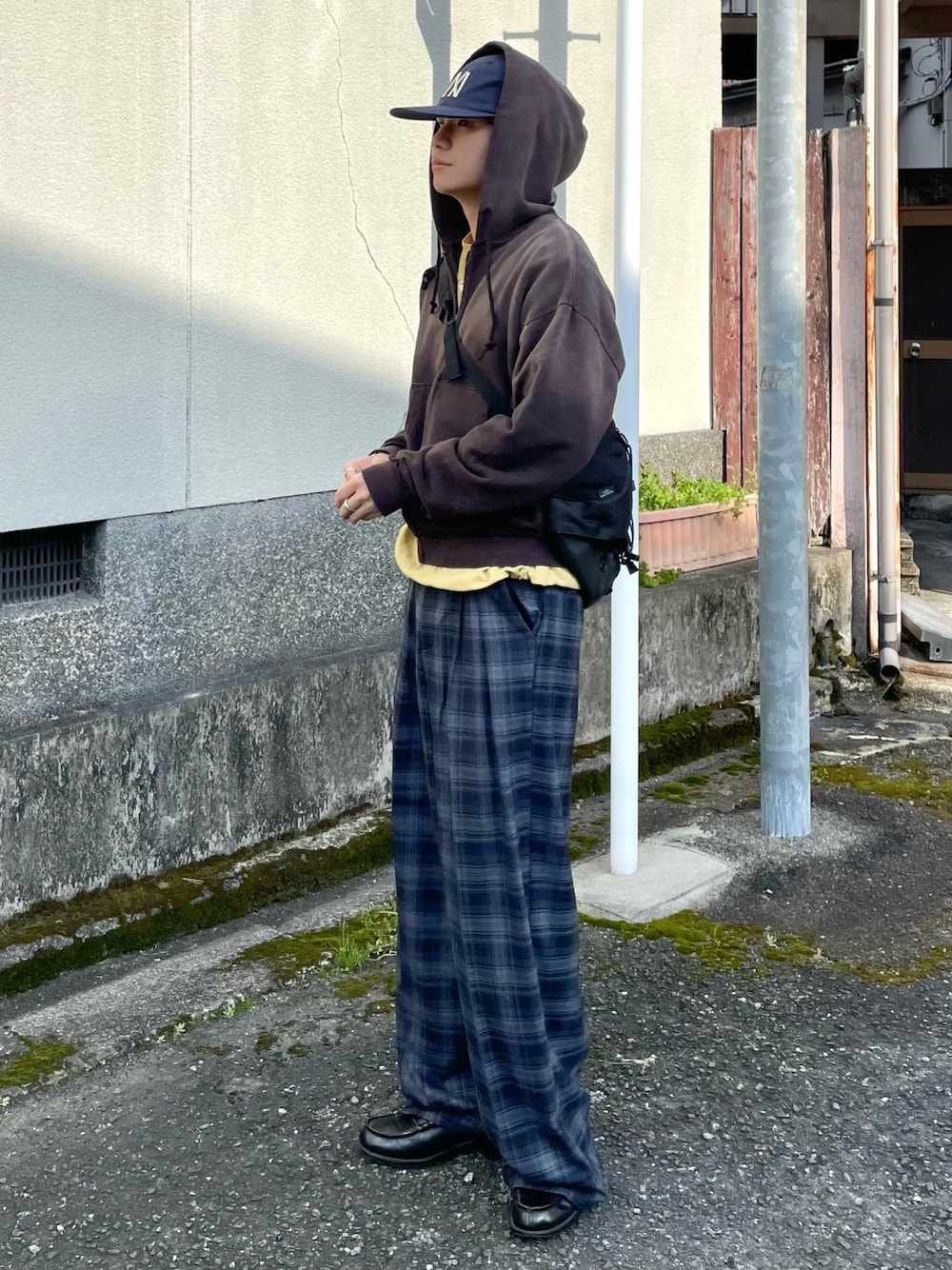 ジップフーディを使ったシティコーデ 少し重ためなブラウンのフーディも、パステルなイエローのレイヤードとネイビーのチェックパンツで春らしく◎ チェック柄スラックス×ローファーは春のシティスタイルにおすすめです🏙