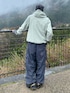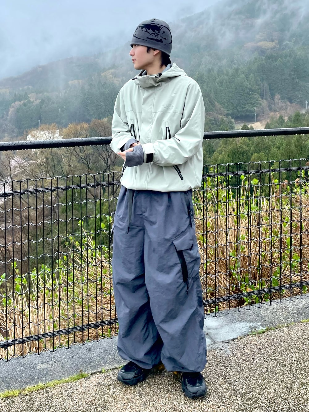 敦賀に旅行した時の1日目のコーデ パキッとした色を使わずに、あえて彩度を落としたトーンで統一することで無機質で都会的なゴープコアスタイルに◎ 1日目雨だったけど撥水機能付きのこのマンパのおかげで楽しめた🐊