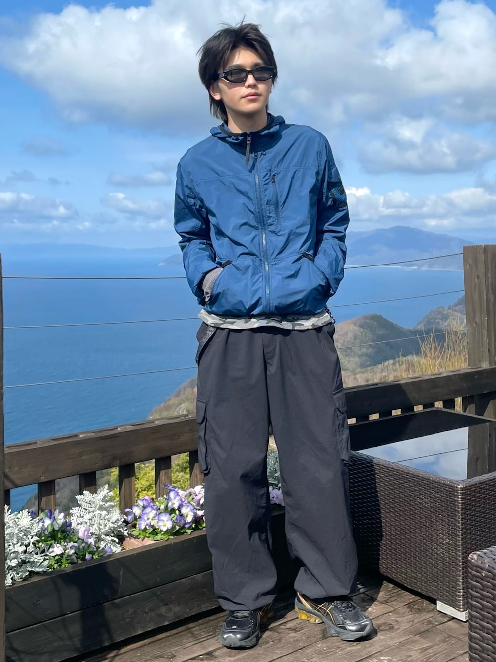 シンプルなテックストリートコーデ ストリート感あるカモ柄のサーマルをインナーに◎ 帽子無し久しぶりだから違和感🥶