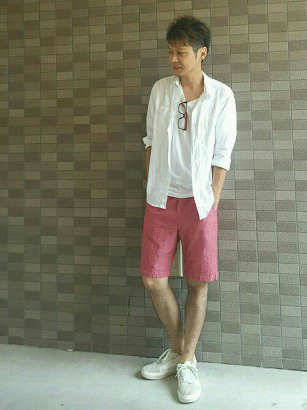 こんにちは☀ シャツ&短パンコーデ✨ 今日は明るめ💡 赤スニーカーと迷いましたが今日は白で👟 水分補給はしましょう🍶