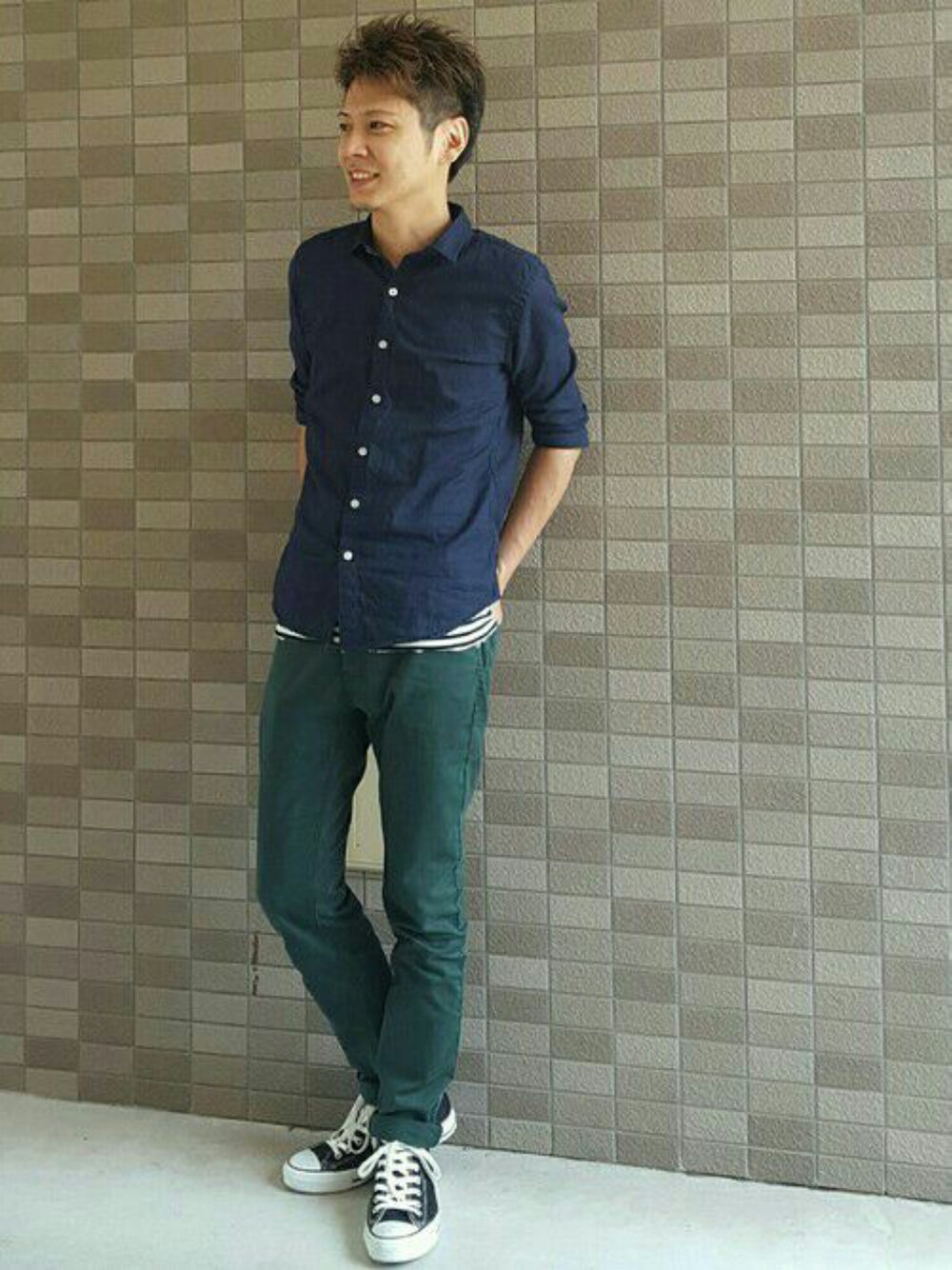 こんばんは🙋 ちょっとベタベタかな。 今日も相変わらず超シンプルで✨ グリーンのパンツ👖久しぶりに履きました🎵 ネイビーシャツはお馴染み👕 ちょっと暑かった💦