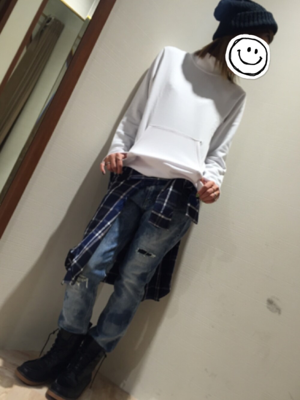 今日のStaff codeです! 実は着用アイテム本日入荷です! 着用staffわ女の子なんですー(≧∀≦) MensLlkeStyleでかっこよく決めてみました♡ モックネックトレーナーめっちゃかわいーい((´∀`*)) 当店でわMADE IN JAPAN denimを気合い入れて販売してまーす!www