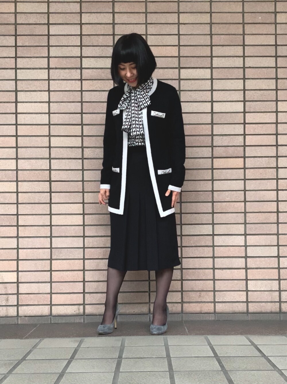 blouse: 10-02-01-011 size1 skirt: 30-02-08-916 size1 cardigan: 30-02-11-903 size1 モノトーンコーデ ナラカミーチェのNを形どった、シンプルかつ大胆なプリントのボウタイブラウスがポイントです。ビット付きカーディガンを合わせてクラシカルに。