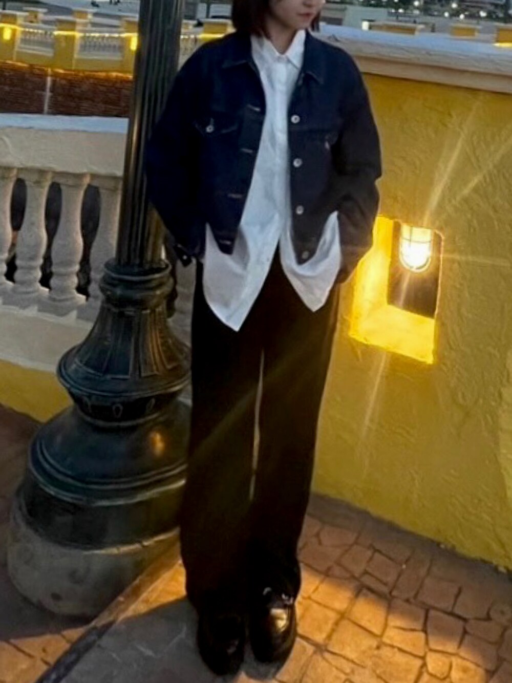 ブルー系のデニムジャケットを着用したレディースの秋コーディネートの1枚目の写真