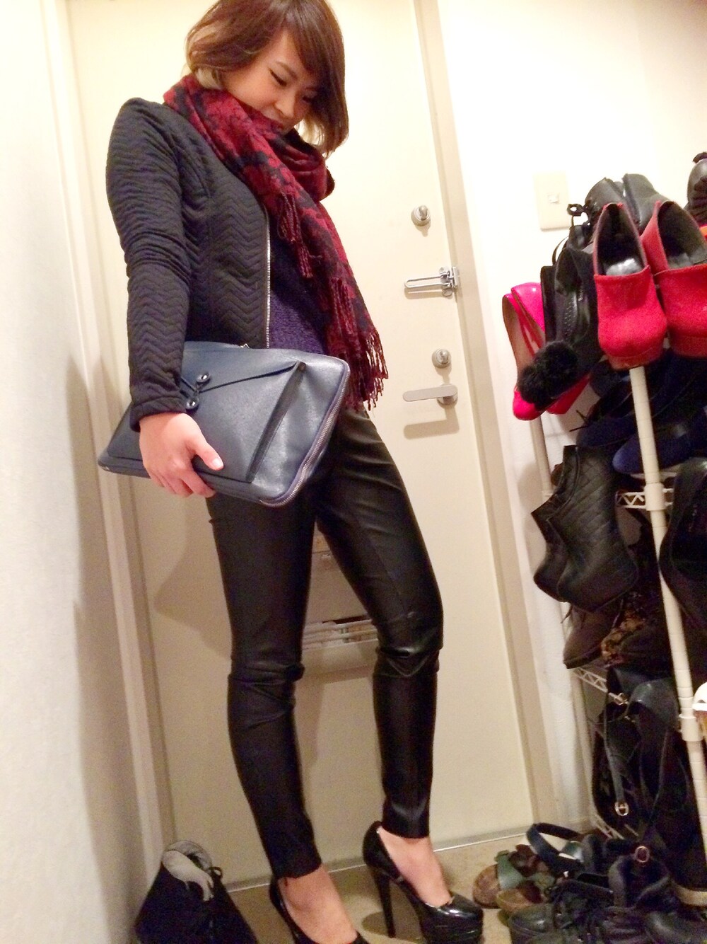 峰不二子になりたかった。(笑) テロテロのレザーパンツ クラッチとショール以外みんなH&Mです。 コスパ高い! 玄関汚くてごめんなさい。