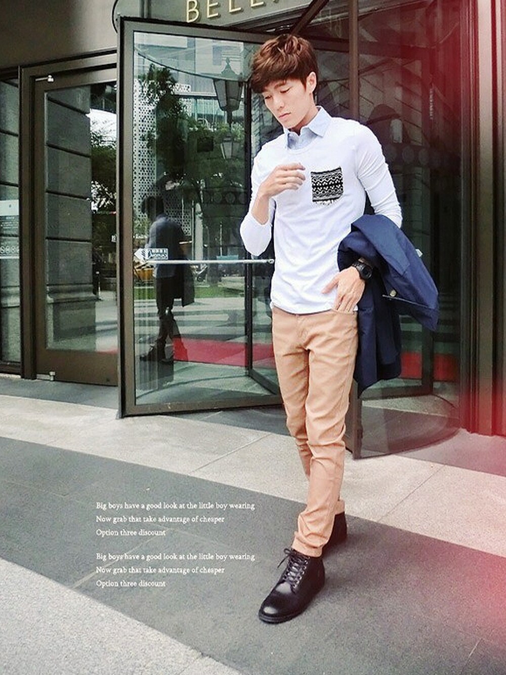 ホワイト系のTシャツ/カットソー、ブラウン系のチノパンツを着用したメンズの秋コーディネートの1枚目の写真