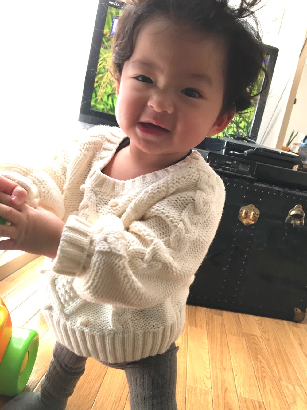 白の大っきめニットが可愛い❤️ 無印の靴下脱げにくくて最高! ご機嫌さん❤️