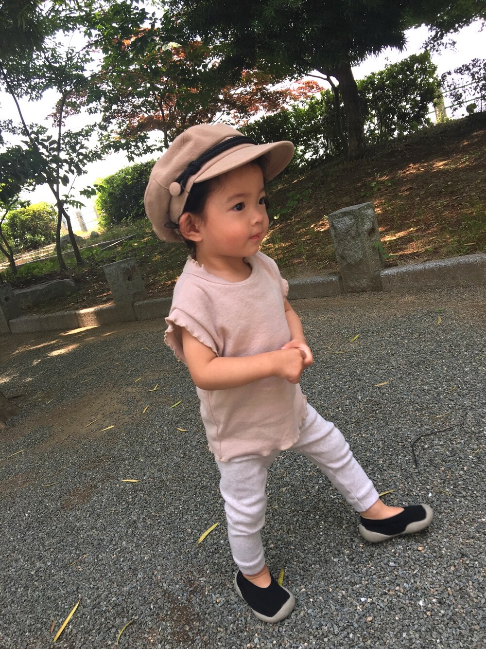 ベージュ系のTシャツ/カットソーを着用したキッズの夏コーディネートの1枚目の写真