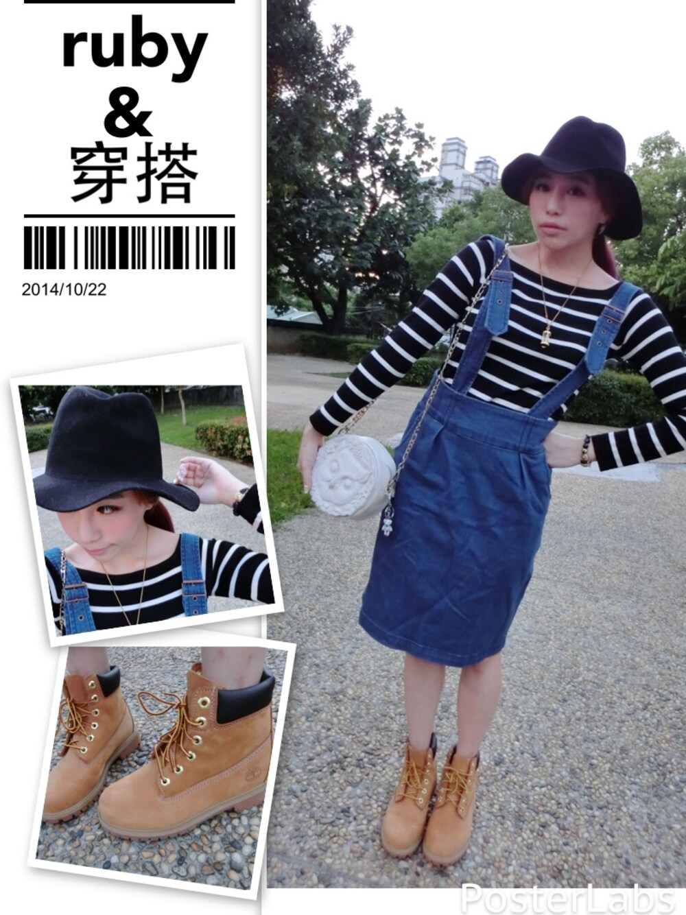 條紋上衣搭配牛仔鉛筆群呈現休閒風, 搭配Timberland經典款營造帥氣的風格, 只要搭配ㄧ頂黑色紳士帽, 在有點微涼的天氣裡, 保暖又有型: )