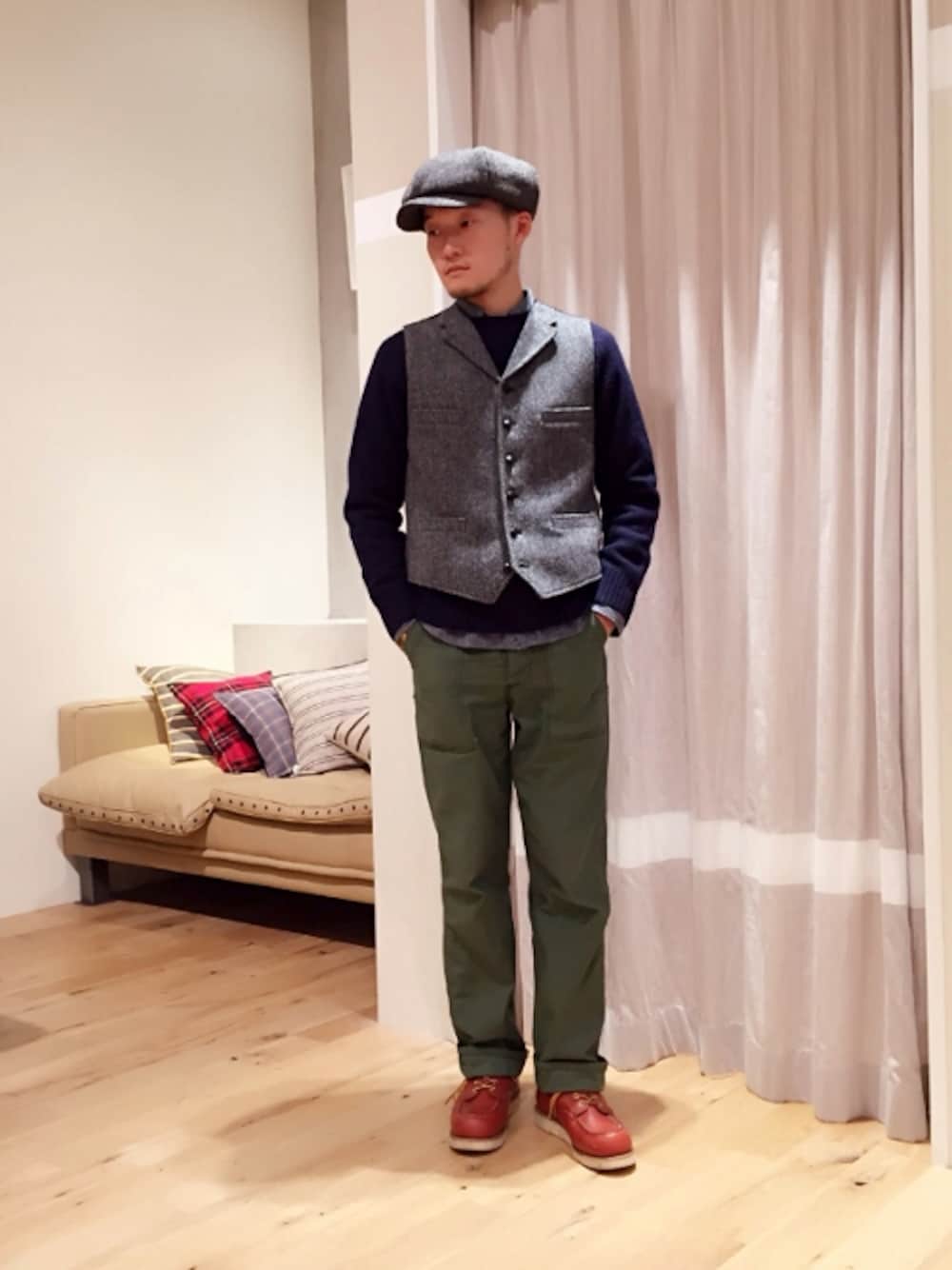 シェットランドニットとファティーグパンツの組み合わせにハリスツイードのヴェストとハンチングでウォーム感をプラス。