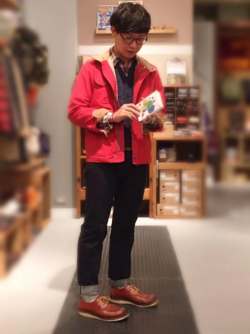 パナミントジャケットの赤を刺し色に定番アイテムでまとめたヘビーデューティスタイル。