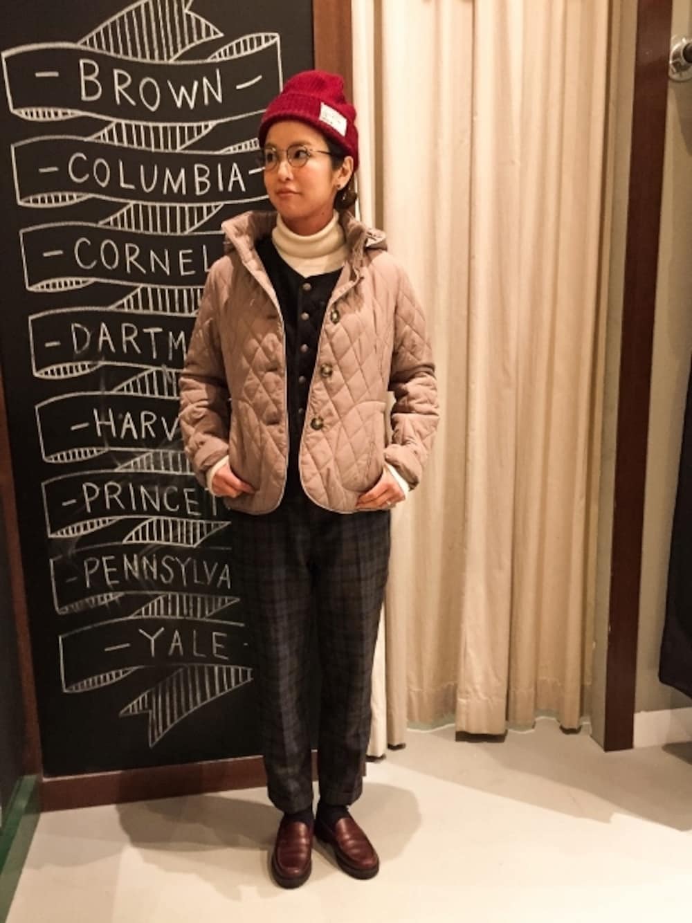 キルティングブルゾンやウールのチェックスラックスを用いたレトロスタイリング。